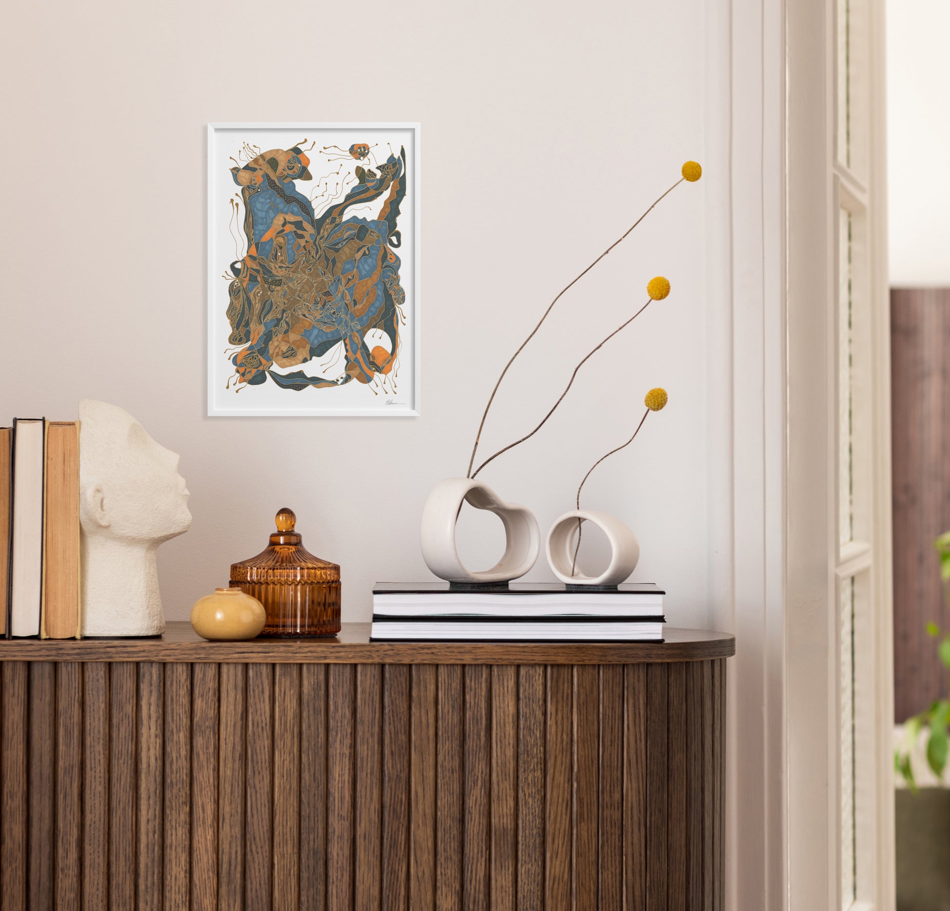 Inspired by the symbolic power of Aztec art, this piece draws on strong geometric design and a sense of the mythological. Rendered in earthy tones with golden outlines, the work has an almost sculptural presence.The central figure seems to emerge like a deity or guardian, its form accentuated by delicate extensions of gold that reach outward, engaging the surrounding space. These filaments act as threads of energy — both framing and amplifying the figure — so that it stands luminous, like a figurehead of a magical realm.