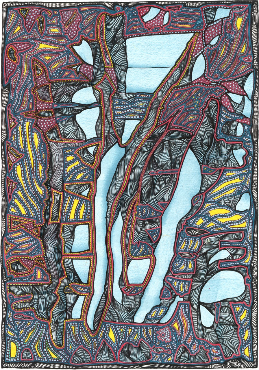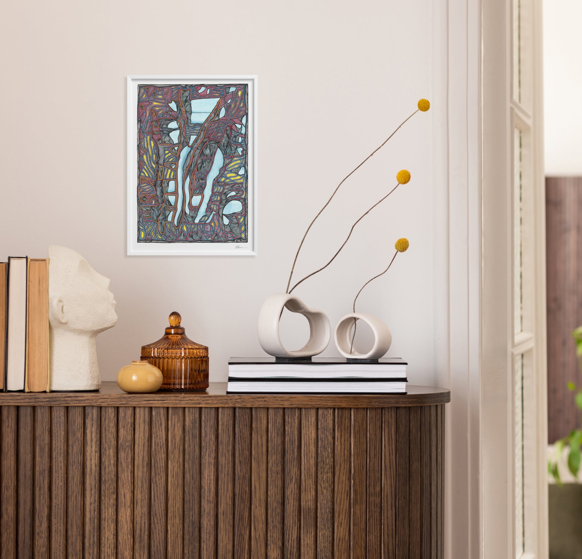 Amid a lattice of intricate, almost regimental patterning, pale blue shapes quietly shimmer. Their meaning is deliberately undefined — suggestions of form that sit in striking contrast to the frenetic energy of the woven markings around them. Behold invites the viewer to look beyond the surface bustle of a busy mind and sense the calmer, more wondrous layer that lives beneath. It’s a reminder that stillness is always present under our habitual noise, waiting to be noticed, waiting to be met with awe.