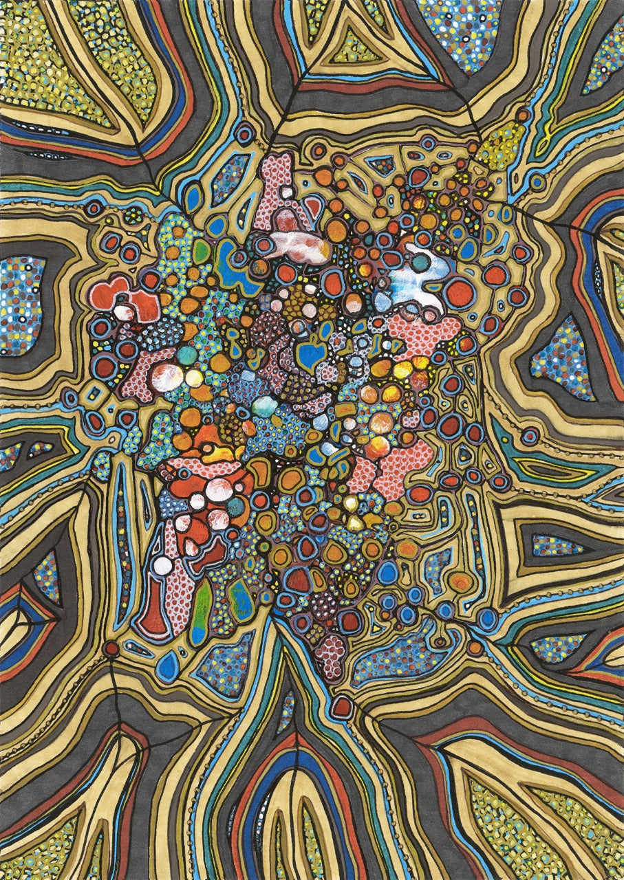 Like peering into the crystalline lattice of a gemstone, Gusto dazzles with an explosion of geometric form and vibrant colour. Its facets interlock and radiate outward, reminiscent of the raw, intricate beauty revealed in the cross-section of stone. The painting brims with the exuberance of early Spring — that moment when the earth shakes off its winter slumber and bursts into renewed life. It is a celebration of energy rising, of colour returning, of the unstoppable joy that accompanies beginnings.